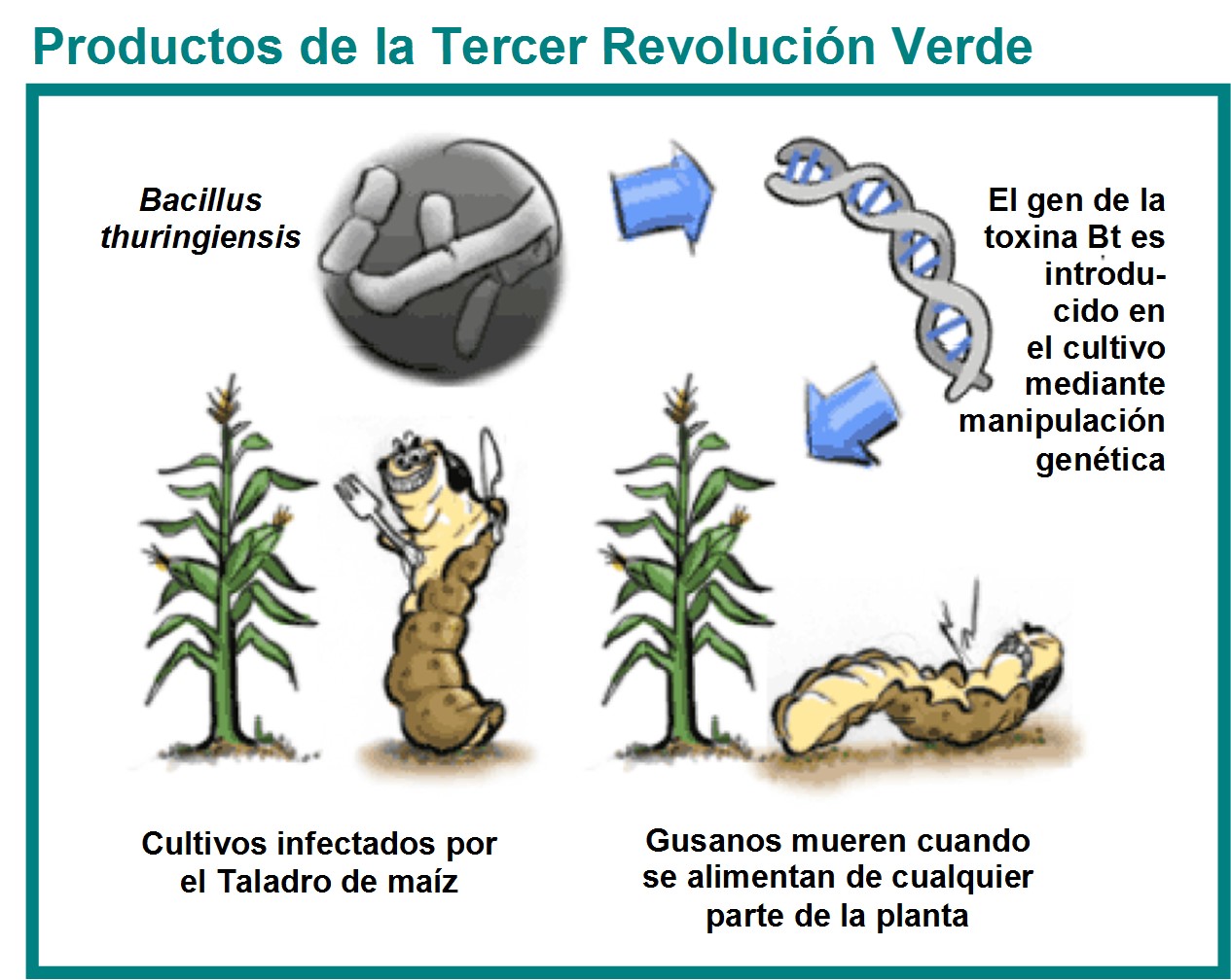 La ingeniería genética es la manipulación genética de una secuencia de ADN, ya sea esta proveniente de una bacteria, de un hongo, una planta u/o cualquier organismo vivo. De esta manera, una vez identificado un gen de interés en un organismo particular como el caso de nuestra toxina bacteriana, es posible cortarlo de ese organismo y pegarlo en otro organismo vivo como una planta, proceso conocido como transgénesis. Así, la nueva planta transgénica va a expresar esa nueva información genética que codifica una proteína que produce una toxina, y cualquier insecto que se alimente de una parte de ella va a sufrir la acción de esta toxina.