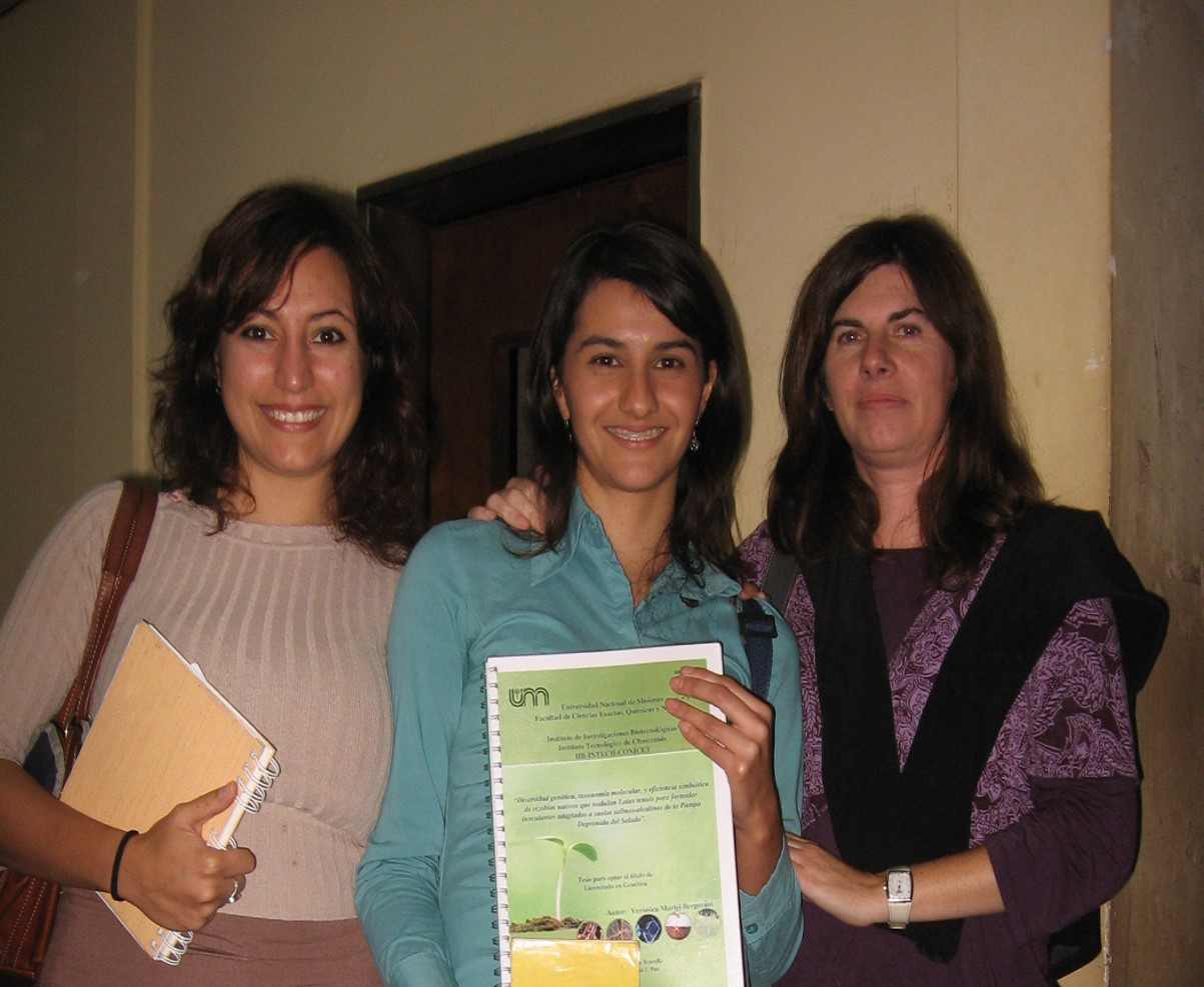 Fue estudiante de la carrera de Licenciatura en Genética de la Universidad Nacional de Misiones, se integró a una de nuestras lineas de investigación en el 2007. Durante ese periodo, colaboró con la caracterización de la capacidad simbiótica de cepas de rizobios aisladas en suelos salinos de la Pampa Deprimida. Esta tesina fue realizada en el IIB-INTECh (Chascomús) bajo la dirección de la Dra. Maria Julia Estrella y bajo mi co-dirección. Verónica se recibió en mayo del 2008 con una calificación de 10 felicitado.