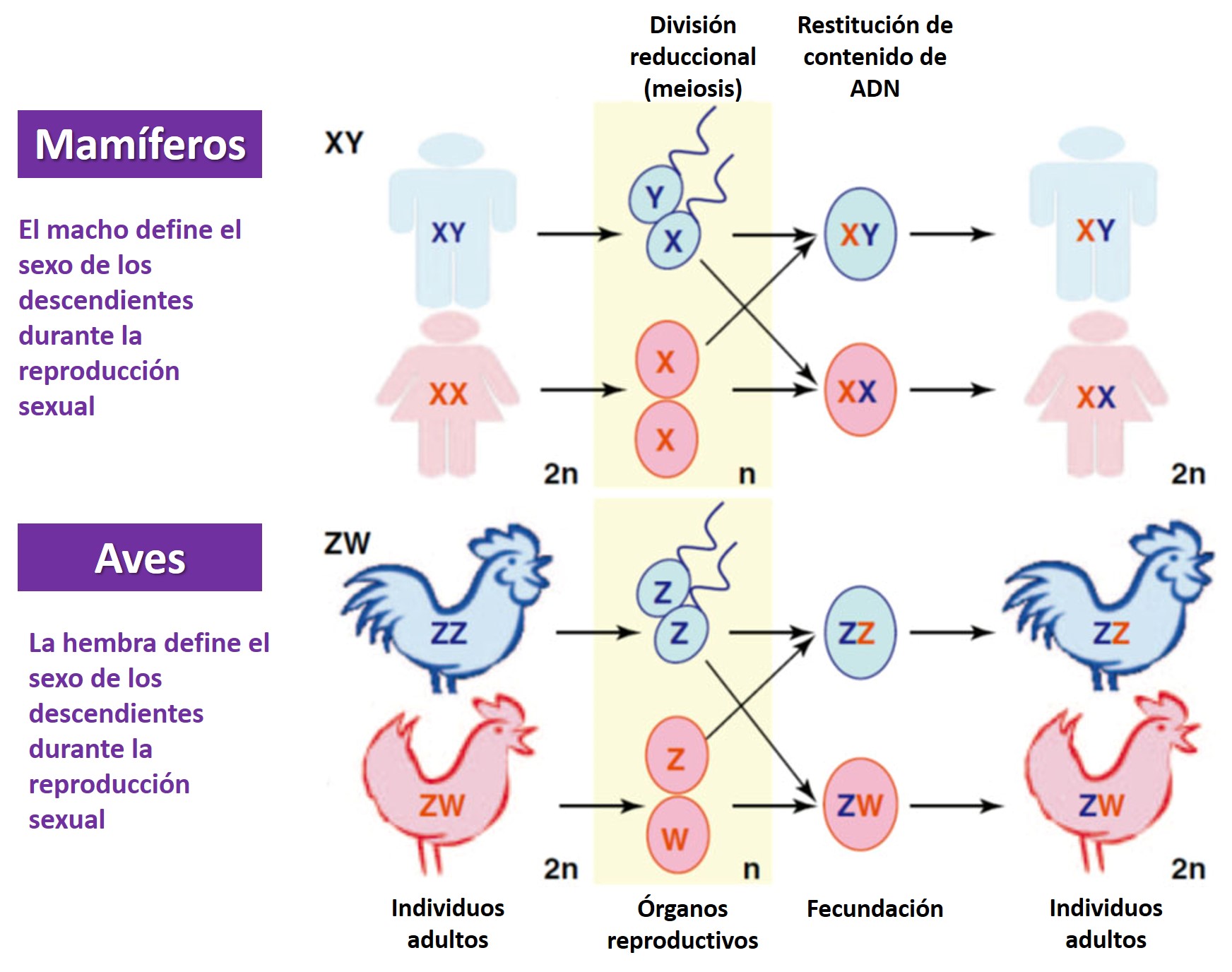 No obstante, en las aves y en los mamíferos como nosotros, la sexualidad es un aspecto mucho más especializado, estando la información genética que define el sexo empaquetada en unidades conocidas como cromosomas sexuales (los cromosomas X e Y en mamíferos y Z y W en aves). En el caso de los mamíferos, el par de cromosomas XX definen el sexo femenino y el par XY el sexo masculino; mientras que en aves es al revés. La falta de un cromosoma sexual (X0) o cualquier forma de desbalance (XXX; XXXX; XXY; XYY) produce severos trastornos genéticos y malformaciones congénitas en el individuo que los porta, siendo letales en la mayoría de los casos.