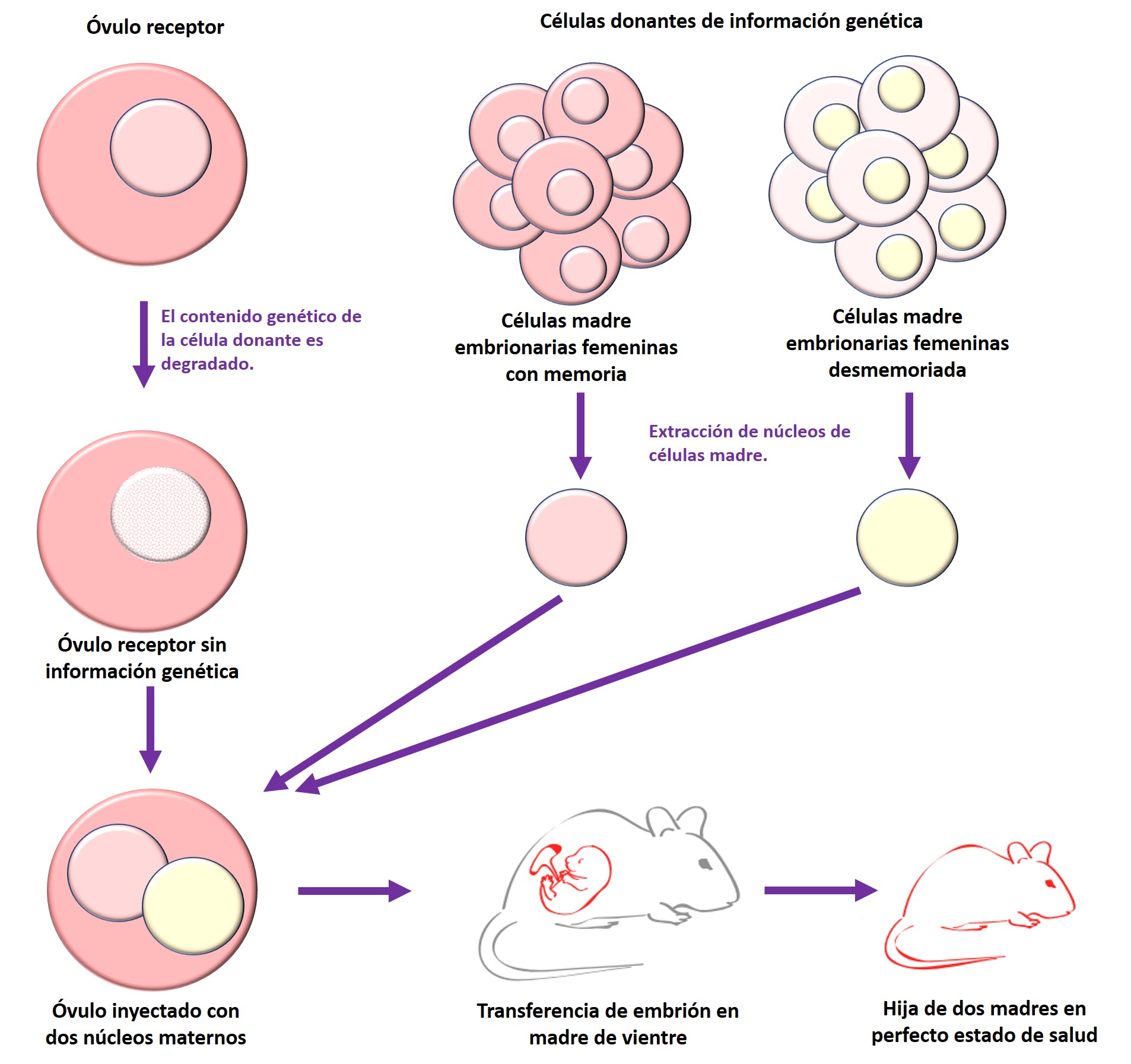 En el caso de los estudios de fecundación entre dos hembras, la información genética de una célula sexual femeninas desmemoriadas se fusionó con la información genética de una célula sexual femenina normal utilizando un óvulo sin información genética como receptor que fue incubado en el vientre una ratona. Una vez fusionada la información genética de ambas progenitoras, tuvo inició el proceso de desarrollo normal del embrión. Las ratonas descendientes de este proceso resultaron perfectamente sanas, y cuando llegaron a la adultez se pudieron cruzar sin problemas con machos, y tuvieron descendencia perfectamente normal. Los experimentos con fusión de células sexuales masculinas no tuvieron la misma suerte, habiendo muerto los ratoncitos a los pocos días de nacer. Esto se debe a que los procesos de memoria genética en los machos son más complejos y fuertes que en las hembras.