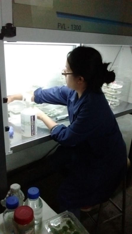 Florencia se incorporó al equipo con el desafío de ajustar la metodología para el aislamiento, conservación e identificación de los oídios del zapallo. Esta enfermedad está causada por un hongo que es biótrofo obligado, o sea que necesita tejidos vivos para poder sobrevivir, no siendo posible su aislamiento o conservación utilizando medios de cultivo o fuera de la planta. Debido a esta razón, el hongo es tan difícil de estudiar y escasea la información al respecto.
