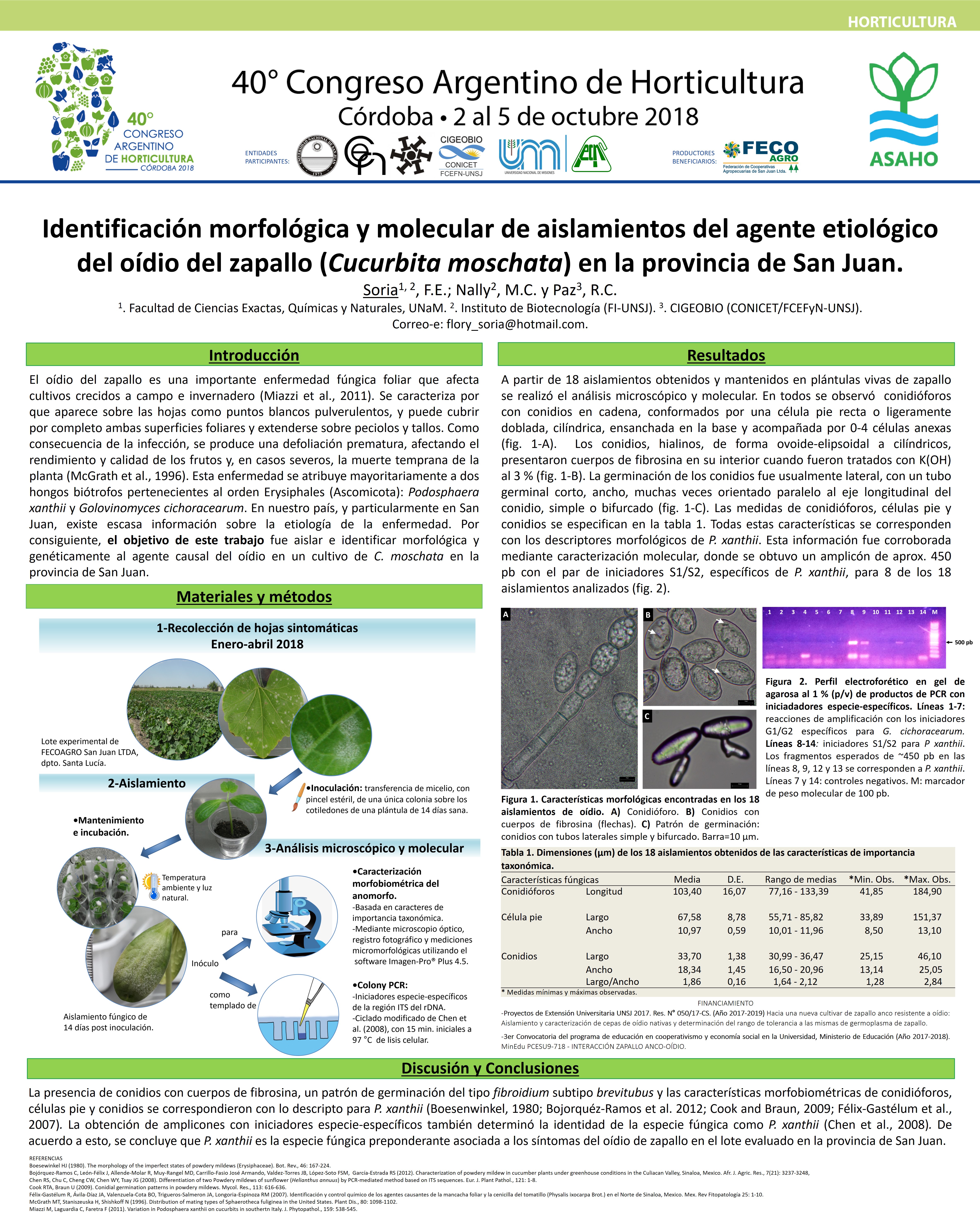 - Soria FE, Nally MC, Paz RC. Identificación morfológica y molecular de aislamientos del agente etiológico del oídio del zapallo (Cucurbita moschata) en la provincia de San Juan. 40° Congreso Argentino de Horticultura. 2 a 5 de octubre de 2018.