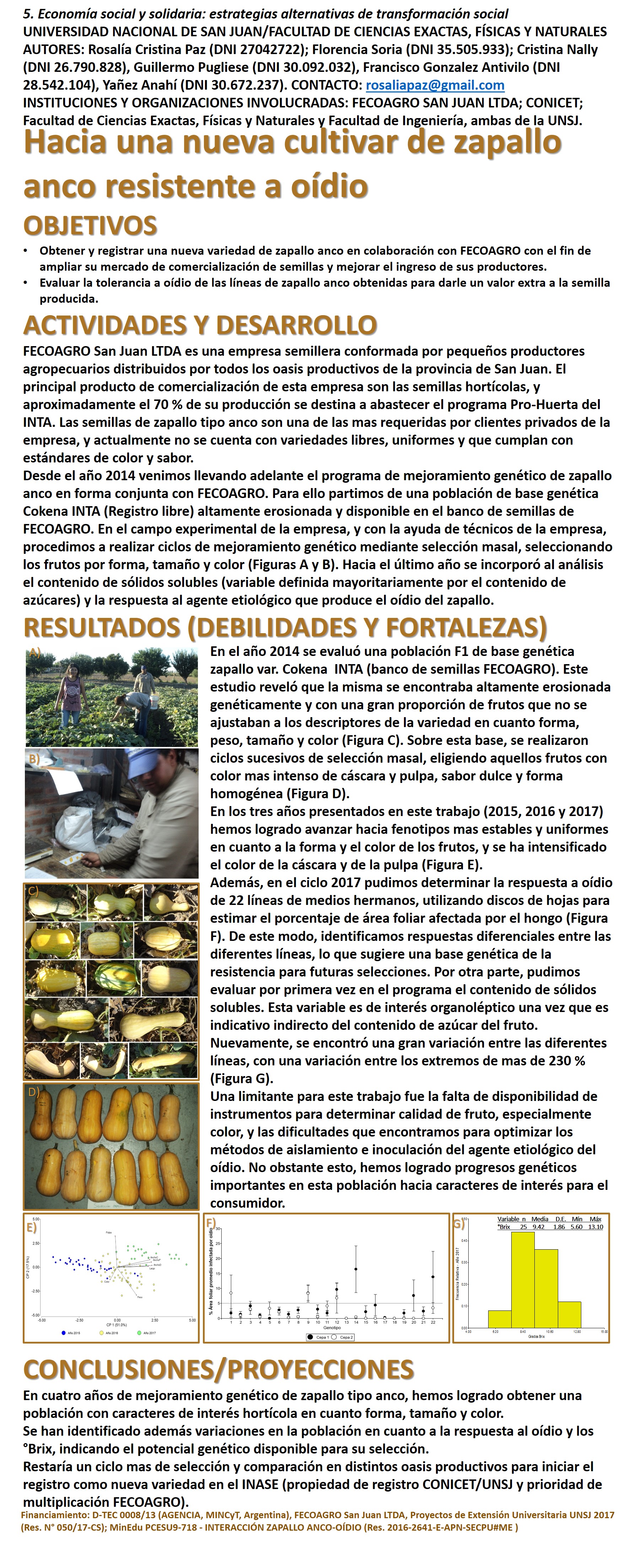- Paz RC, Soria FE, Nally C, Pugliese G, Gonzalez Antivilo FA, Yañez Santos AM. Hacia una nueva cultivar de zapallo anco resistente a oídio. 8° Congreso Nacional de Extensión Universitaria. San Juan, 5 a 7 de septiembre de 2018.